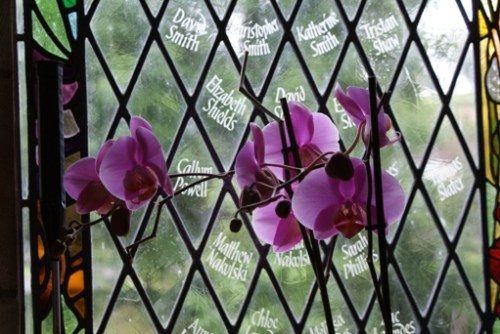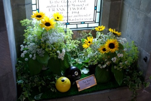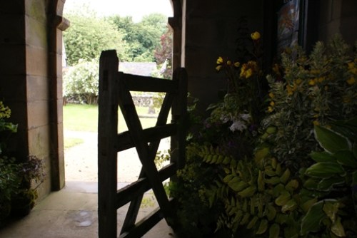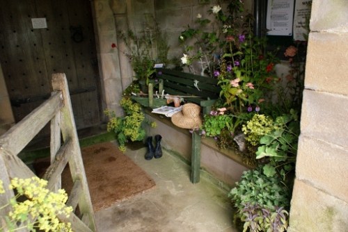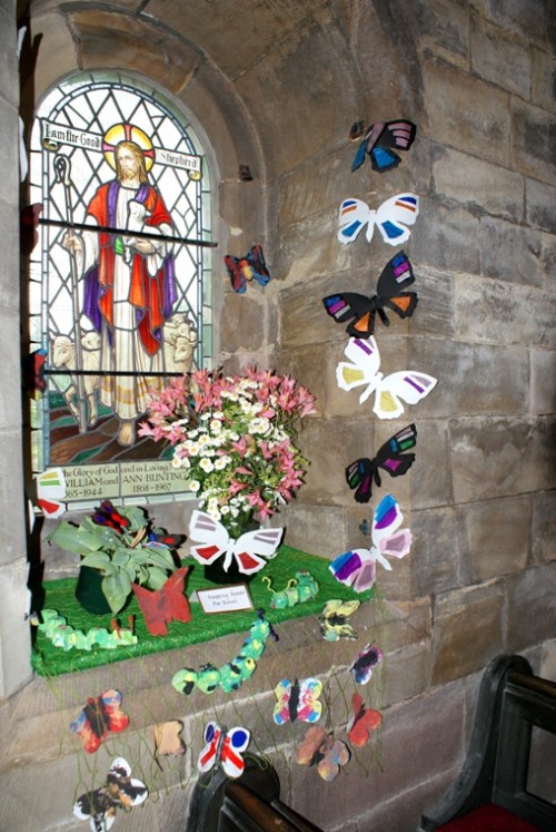 Perhaps they’ve popped into the church for a minute? Have a look: once inside, you’ll find a wonderful variety of imaginative displays to admire and possibly some of the designers, as well as the new tympanum and display board and Miss Graham’s window.