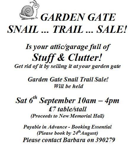 Please note the new date – Saturday 6th September, just before the children go back to school. This event is run on a similar line to the Garden Open day but instead of looking at gardens, visitors will hopefully buy all your excess furniture, antiques and bric a brac that you put out at your garden gate. You can have just a table top or a gazebo – or two or three if you have lots of stuff. A numbered map will be sold to vistors for a token fee who will then walk around the village finding the numbers and all your unwanted treasures.