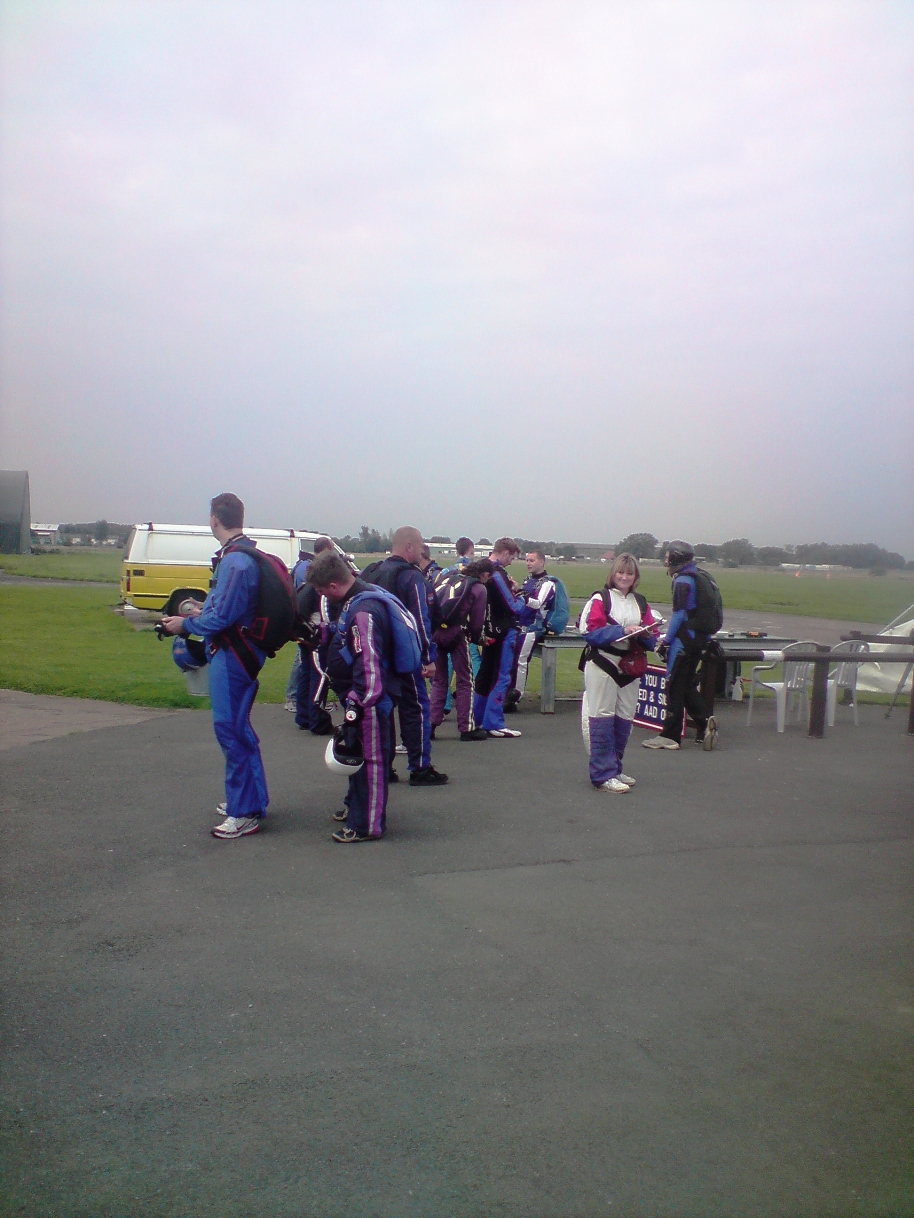 At 4pm the word came through that the cloud-base had lifted sufficiently, the three scheduled tandem jumpers (two girls and a chap) hastily kitted up, and the three instructors appeared on the scene. Denise (hyped up, psyched up, and true to form) said ” Aye, I like that big tall bloke with the little beard – I don’t want the others“, and I need hardly need to say that they had eyed each other up and that she got her man. We’d also engaged a camera-man, and the photos show the trio waiting to join the plane (along with the solo divers).
