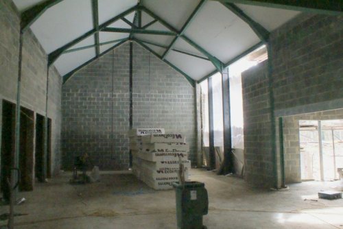 On Saturday the woodwork for the main roof was completed, ready for the Staffordshire Blue tiles to go on this week. As the photo and the video of the main hall shows, the internal scaffolding has now been removed and the large pile of insulation has been placed, both on the ceiling and on the floor, prior to the pipework for the heated floor being installed this week. Once the pipes are in place a concrete screed will be laid over them.