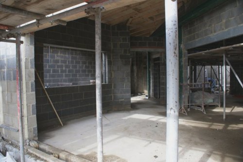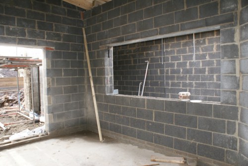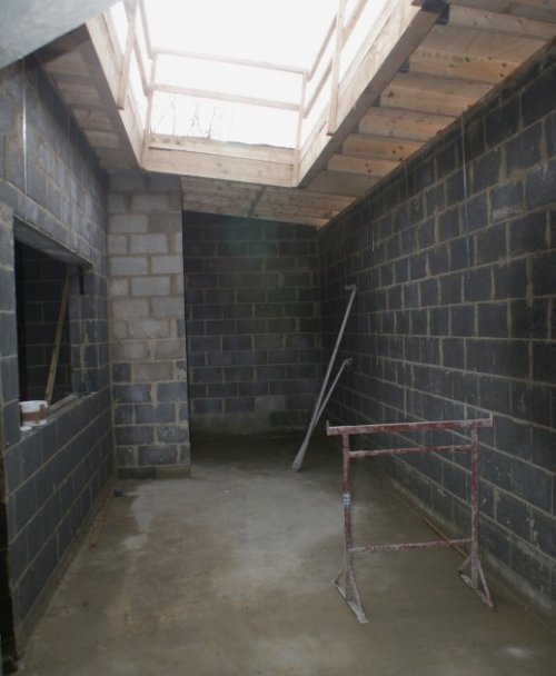 Looking into the kitchen, the roller shutters will be on the left with a large roof light above.