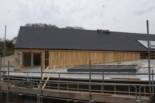 Outside the oak planking is nearing completion, as can be seen from the photos. All the solid oak, external doors and windows are in situ. The roof lights in the photo below show the location of the kitchen, which is now ready for fitting out.