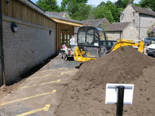 Today, 20 tons of topsoil were delivered. Some of the beds have been excavated to remove the soil, whilst others have had smaller amounts of soil removed before being topped up and the beds at the rear are having their soil levels generally raised. The beds excavated by the community notice board were done so in an attempt to remove as much of the existing bindweed as possible and minimise this problem. The landscaping company has removed the majority of the shrubs; new ones will be sourced, inspected, planted and bark mulch will be added to all beds. It will be several weeks before the planting is redone.