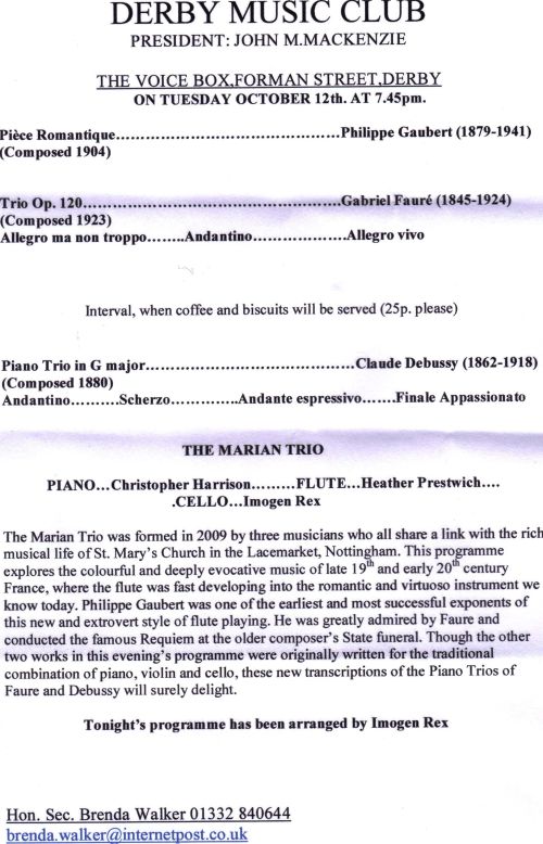 I have mentioned to some of you that a couple of friends and I have formed a flute-cello-piano trio which will be giving a concert next Tuesday evening in Derby. The programme is entirely French – a trio by Debussy written when he was 18, a trio by Faure written when he was 77, and a rather sentimental piece by the flautist Philippe Gaubert (no, I hadn’t heard of him either, but it’s rather fun in a kind of pre-First World War way).