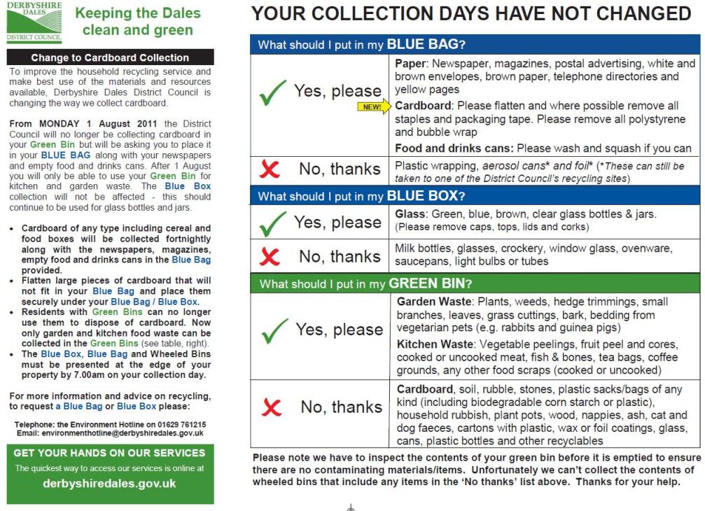 Leaflets have been dropped off at every house informing everyone that the Saturday Bulk Rubbish finishes on Saturday 27th August. This means that Alsop get their final collection on 6th August and Ballidon on 13th August, but there will be no further collections in Parwich.
