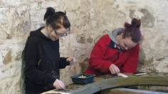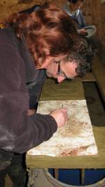 I have been busy outlining a rose and leaves on the right hand board. It is quite fiddly and as I want to match up the veins on the leaves with the design on the left hand board I then swap over. It’s at this point I realise that this part of the picture is not a mirror image. It would have been really obvious to us if it had been left, maybe not to the visitors. So after lunch Edward erases the outline, the template is flipped over and Margaret shows Edward how to prick out the design.