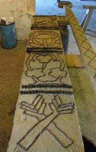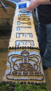 Margaret’s creation this year is a not purely religious. The central picture board, which isn’t started until tomorrow, is the story of the Good Shepherd, but the rest of the boards are designed to celebrate the Queen’s Diamond Jubilee. Framing the central board are the words Queen Elizabeth Diamond Jubilee with crowns at the base. The outer boards show the national emblems of the UK: the rose, thistle, shamrock and leek.