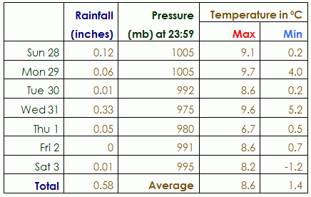 A pretty good forecast last week, with Halloween proving the most unpleasant day of the week, as predicted – as a result we only got four sets of children demanding sweets with menaces, and Val and Nia must have stayed at home in front of the fire!