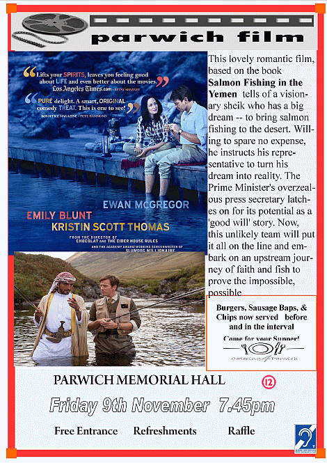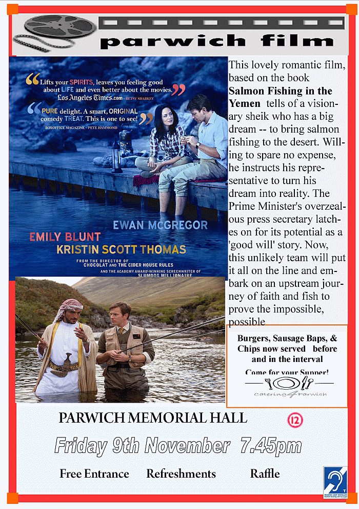Catering4Parwich will be serving Burgers (£2) and Sausage baps (£1.50), along with chips, tea, and sweets for the children. Come and have your Supper before the film showing! Or in the interval.