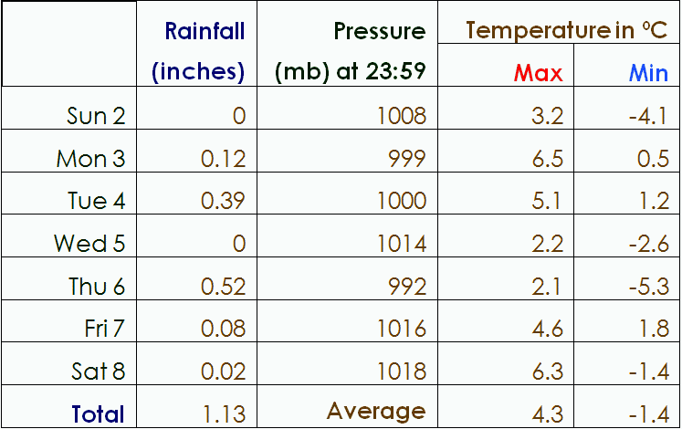 Winter is definitely here, and the past week has been colder than average. After today’s brief spell of wet and windy, during the week ahead it looks like being a lot drier than recently, but the cold weather will continue with hard night frosts forecast through the week (gritters – be prepared!).
