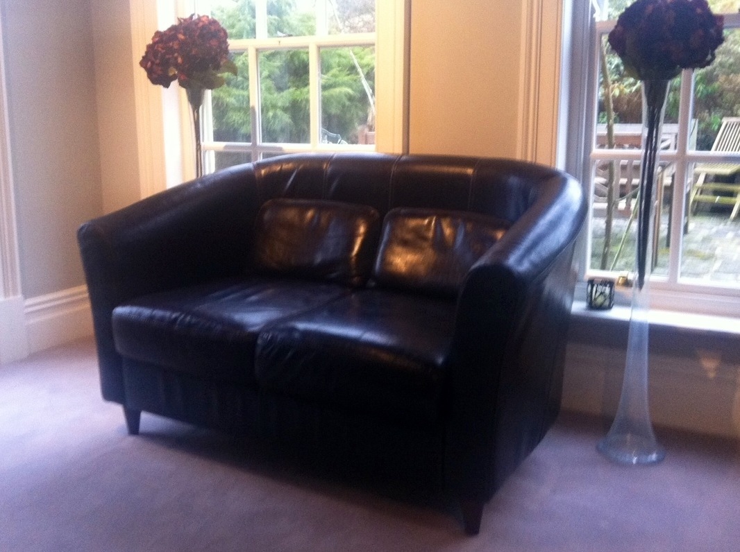 For sale: a matching pair of dark chocolate, real leather club sofas.