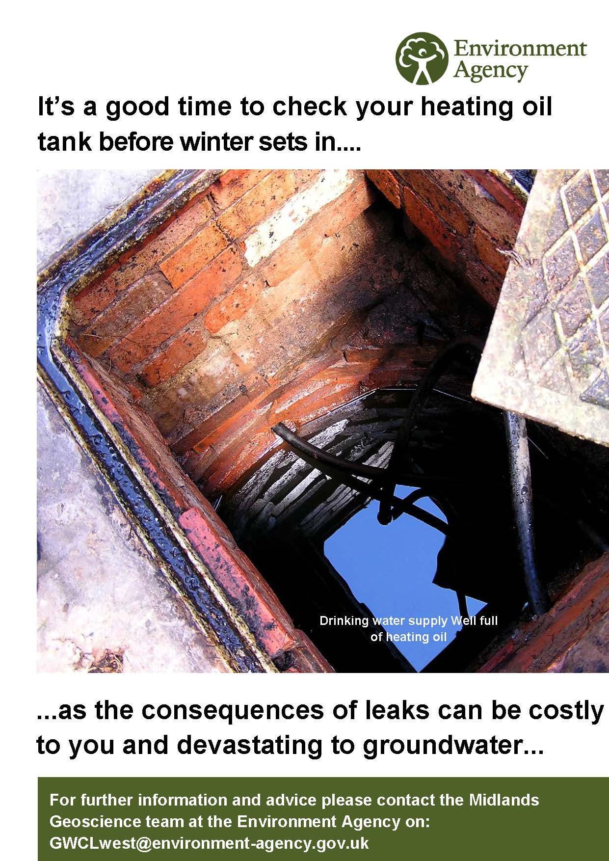 The Environment Agency is concerned to prevent heating oil tank pollution incidents, as they are aware of a number of recent spills, especially from smaller domestic tanks. They are seeking to raise awareness of this issue before the winter sets in, as failures of heating oil tanks and associated pipe work happen most often during the cold snap. “The consequences to groundwater, and rivers for that matter, can be devastating“, they tell us.