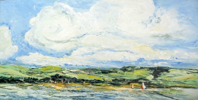 Ruby Hickmott. Rolling clouds over the Dam, Carsington Oil 100x50cm unframed