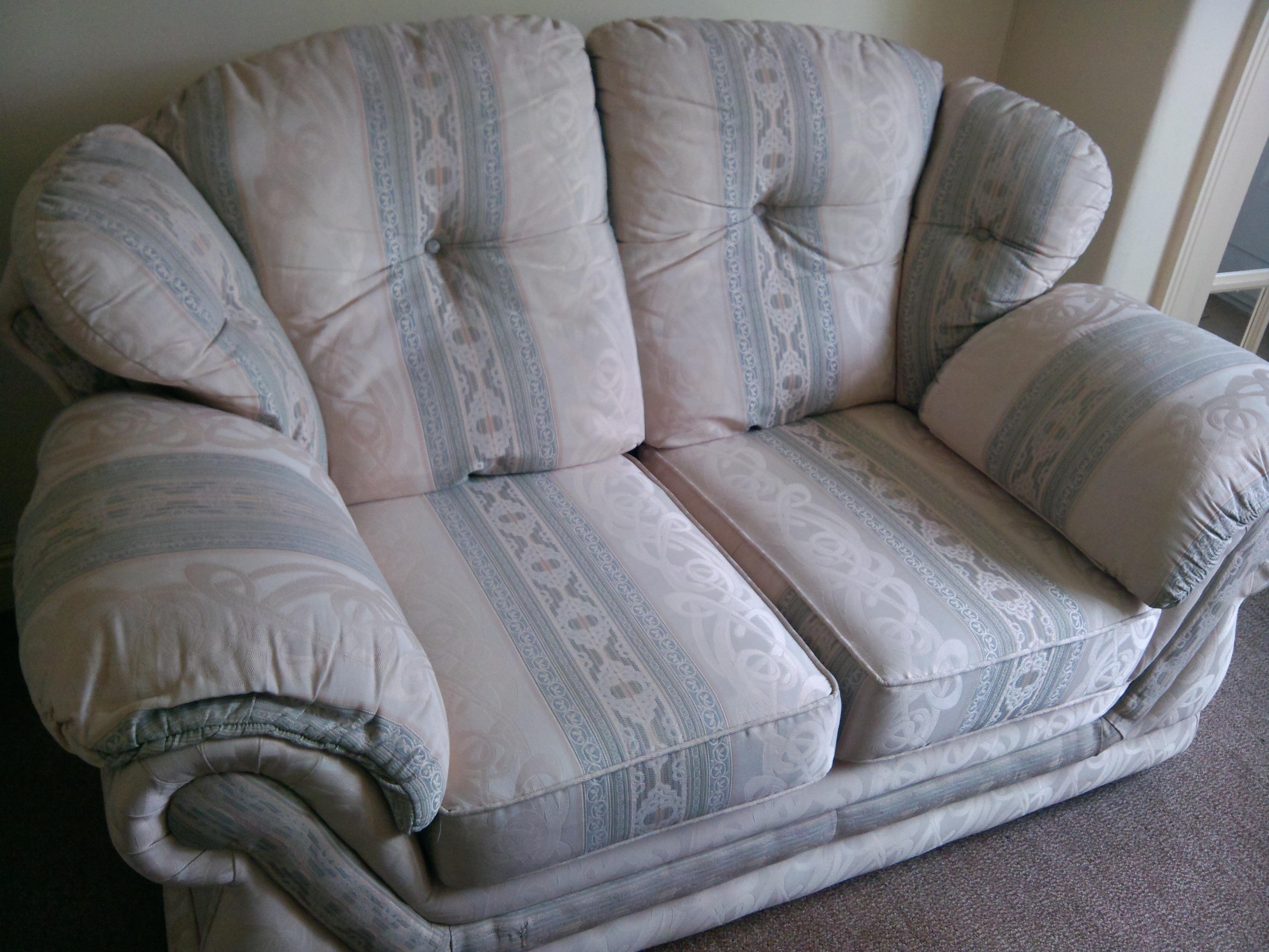2 seater sofa and 2 single beds plus headboards. All in good, clean condition. (The sofa is cream with a light blue/grey stripe)