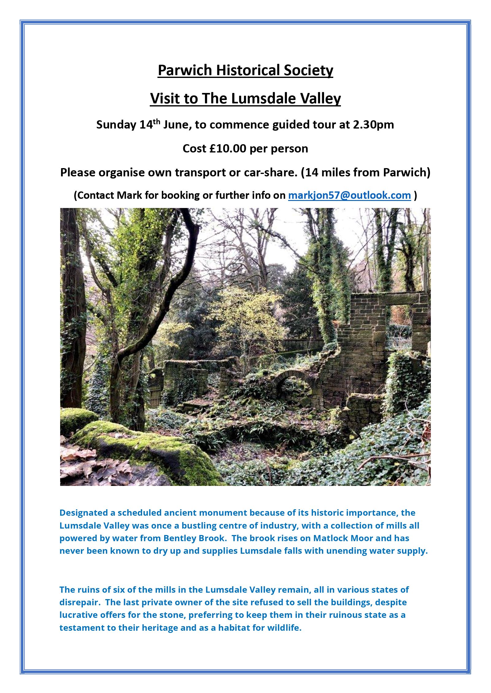 Designated a scheduled ancient monument because of its historic importance, the Lumsdale Valley was once a bustling centre of industry, with a collection of mills all powered by water from Bentley Brook. The brook rises on Matlock Moor and has never been known to dry up and supplies Lumsdale falls with unending water supply. The ruins of six of the mills in the Lumsdale Valley remain, all in various states of disrepair. The last private owner of the site refused to sell the buildings, despite lucrative offers for the stone, preferring to keep them in their ruinous state as a testament to their heritage and as a habitat for wildlife.