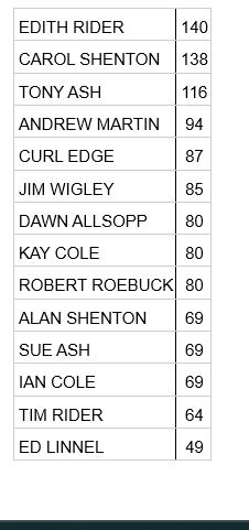 A great turnout of 24 villagers took part in April’s match and it was a close finish for the top spots with 3 people in Joint 7th place and 3 people in Joint 8th place!