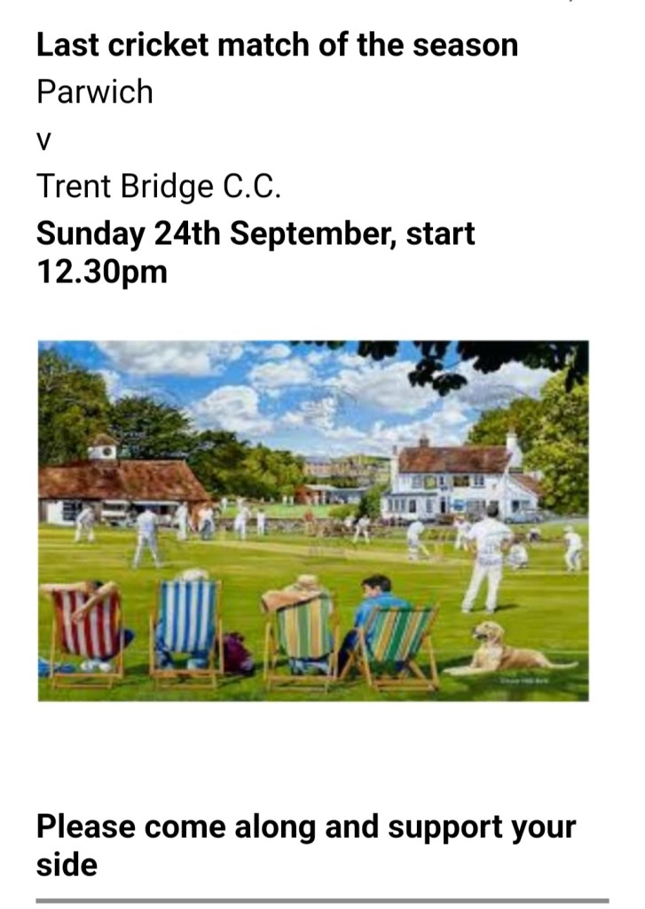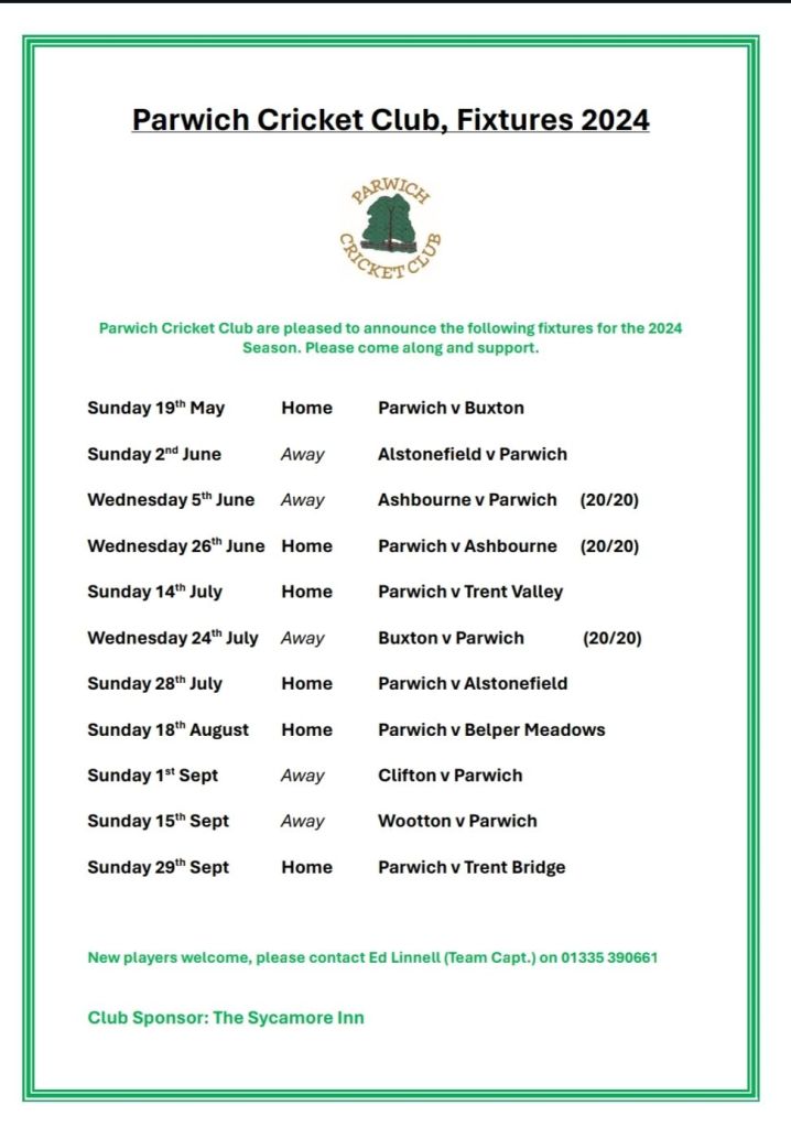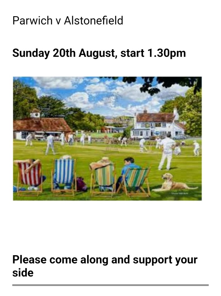 Please note that the Cricket Match at home to Alstonefield, Sunday 3rd August, has had to be cancelled.