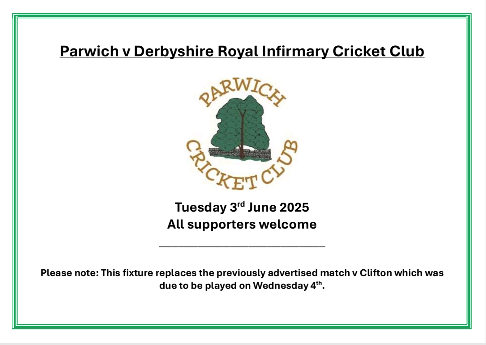 Wednesday 4 June Home Parwich v Clifton 20 overs