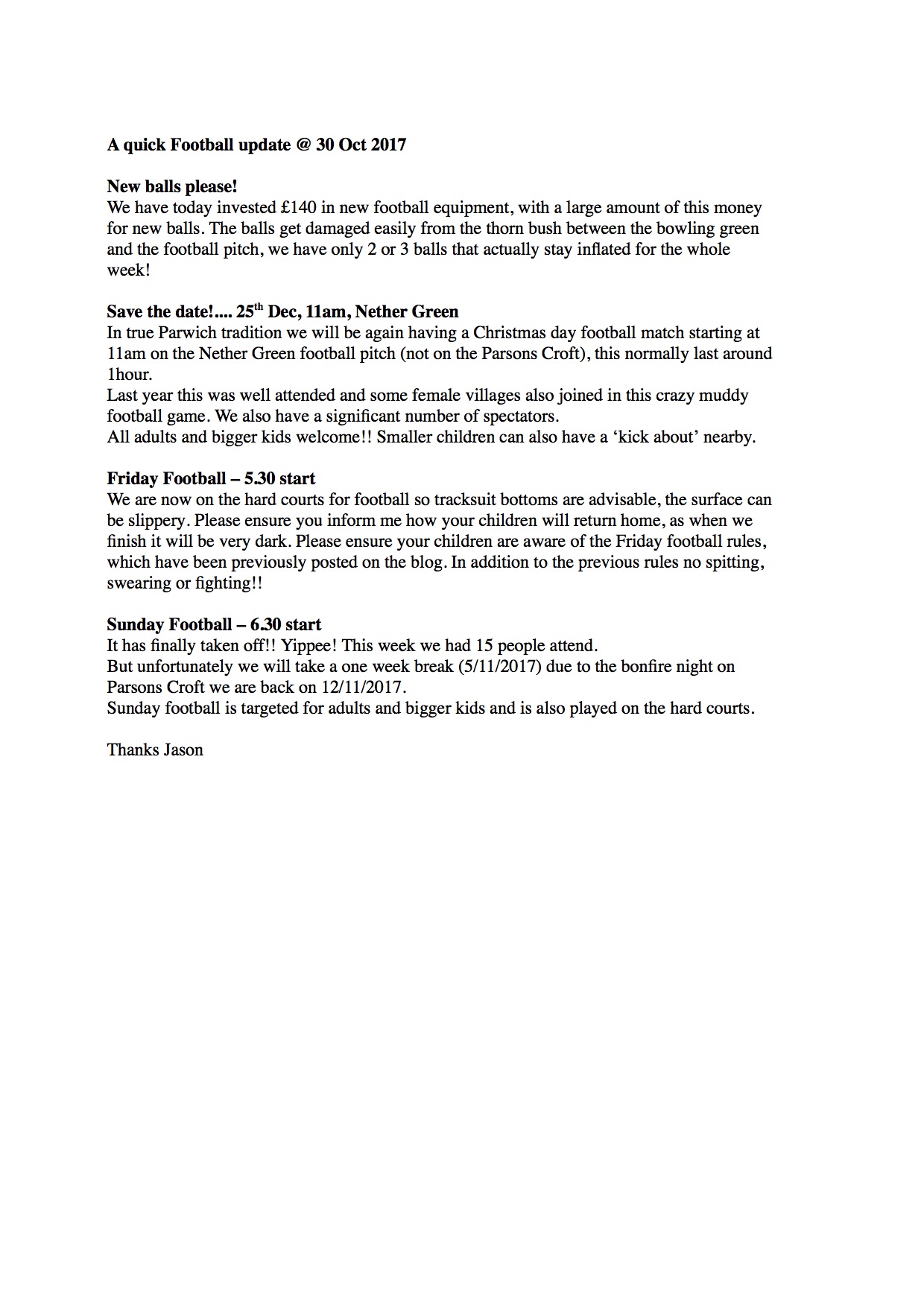 Firstly I would like to thank the Parwich Independent Welfare Fund for their amazing donation to Friday Football.