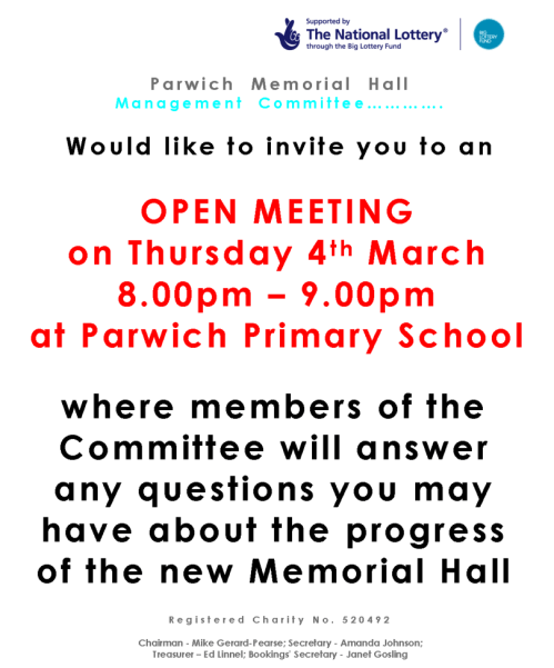 There is an open meeting scheduled for 4th March (8 – 9pm venue TBA), to answer any questions arising from this newsletter. Please also note the AGM will be delayed until 27th May after the final completion of the Hall. In the meantime, as always, every member of your Committee is happy to answer any further questions on an individual basis or questions may be answered by reading the minutes in the shop folder.