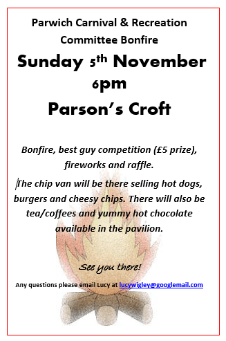 Subject to final approval at the next Parish Council meeting the Village Bonfire and fireworks will take place on Parson’s Croft on Sunday 5th November from 6pm.