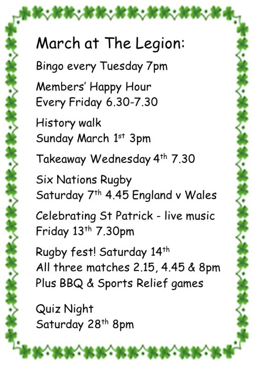 | Fri 13th | 7.30pm | St Patrick’s Day Celebration – Live Music | Legion |