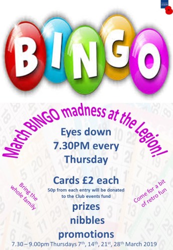| Thu 7th | 7.30pm | Bingo @ the Legion March Bingo Maddness inc nibbles & drinks promotions |
