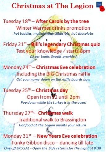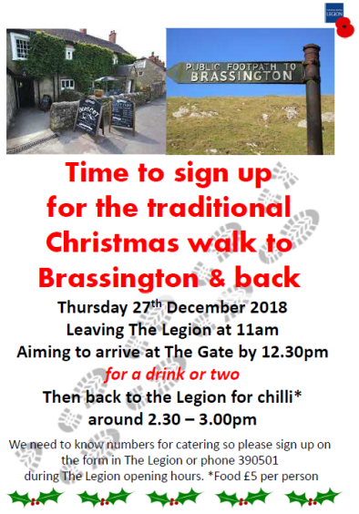 | Thu 27th | 11am | Christmas Walk to Brassington hot food at Legion on return |