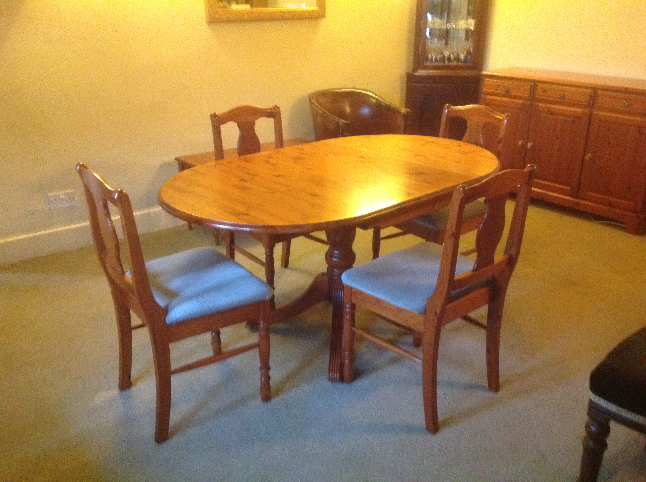 – Pine dining table and six dining chairs