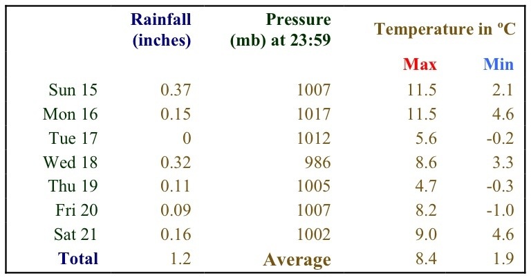 After a pretty wet and miserable mid-winter week last week, the forecast is for lower temperatures with blustery conditions for the coming Christmas week. Indeed, the temperatures may well be low enough for some of the showers to fall as sleet or wet snow – so we might just get some white stuff on Christmas Day – with a better chance over the tops outside the village. Ho ho ho…..!